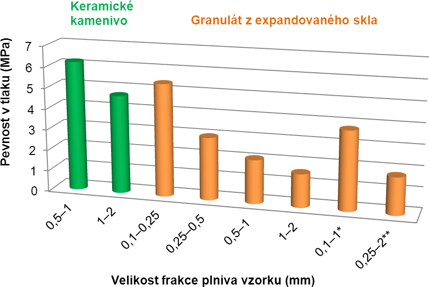 Vzhledem k tomu, že je keramické kamenivo přibližně dvakrát těžší, než granulát z expandovaného skla, bylo složení jednotlivých směsí voleno tak, aby objemový podíl pojiva a kameniva zůstal v obou případech stejný. V našem případě to znamená, že zatímco u keramického kameniva byl optimální poměr pojiva k plnivu stanoven na 15:85, tak u granulátu z expandovaného skla byl tento poměr 27:73.