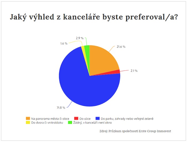 Češi by ve své kanceláři nejčastěji preferovali výhled do zelené krajiny, lesa či městské zeleně (72 %) nebo na panorama města (22 %). Nicméně realita je dramaticky jiná a neshoduje se s přáním zaměstnanců. Většina kanceláří totiž nabízí pouze výhled do rušných městských ulic (35 %), v lepším případě do vnitrobloku (31 %).
