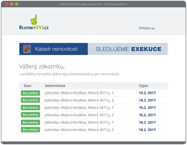 - Každý týden obdržíte až na šest e-mailových adres detailní zprávu o změnách týkajících se všech vlastníků bytových jednotek ve vašem SVJ. Pokud je vše beze změn, dostanete zeleně označený email. Pokud bude nalezena změna, dostanete červeně označený email. A na změnuse budete moci kliknutím podívat.