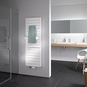 Dalšími, ze zde prezentovaných novinek, byly nové produktové řady koupelnových žebříků, tedy otopných těles kombinujících dva účely, vytápění místnosti a sušení ručníků a osušek. Zatímco předchozí zmíněný výrobek bude stavebníky a architekty kladně hodnocen především za své technické parametry a účelnost, žebříky přitahovaly pozornost hlavně svým designem. Prestižními oceněními se mohla chlubit například firma Vasco, jejíž výrobky Canyon (obr. č. 2) a Beams (obr. č. 3) zvítězily v German Design Award 2013, resp. Red Dot Design award 2014. Tato tělesa představují skutečný architektonický prvek, který bude ozdobou každé koupelny a přitom je jeho design výjimečně praktický, podobně jako například žebříky Tabeo, Casteo či Geneo od Kermi (obr. č. 4).