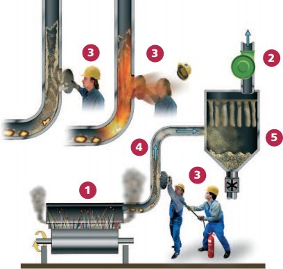 - V potrubí se nacházel usazený prach vzhledem k nedostatečnému proudění vzduchu a špatnému konstrukčnímu uspořádání.