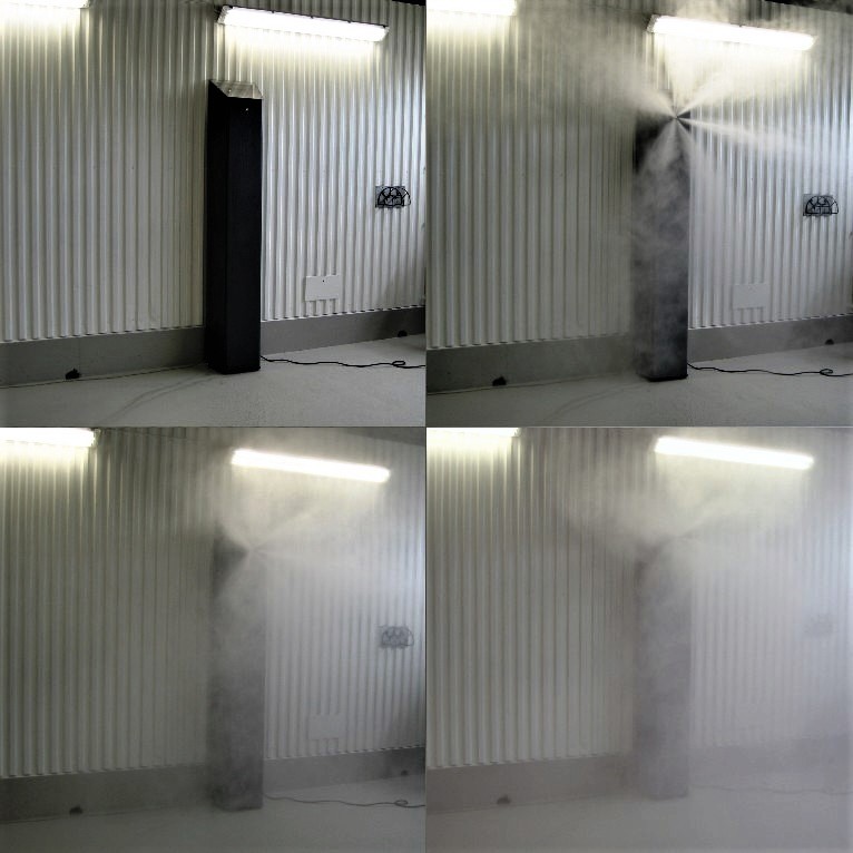 Bylo provedeno 12 ohňových zkoušek ve zkušební místnosti s výškou 2,5 m, 3,5 m a 4 m. Všechny zkušební ohně byly uvedeny pod kontrolu vysokotlakými hlavicemi s K faktorem 4,1 při tlaku 80 bar s následným ručním dohašením po 30. minutě. U referenčních sprinklerů byl K faktor 60 a intenzita dodávky 5 l/min.m2. Rozsah poškození a teploty byly příznivější u vysokotlakého mlhového SHZ než u referenčního sprinklerového zařízení. Pro nejhorší scénář, s výškou stropu 2,5 m a požár s ohniskem mezi čtyřmi sprinklery, byla teplota při sprinklerové ochraně v u stropu 348 °C a při hašení vodní mlhou 204 °C. Pokud jde o rozsah poškození, pak u mlhového zařízení se s výškou místnosti nepatrně snižovalo z 39,1 % na 33,9 %. U standardní sprinklerové ochrany se s výškou místnosti naopak zvyšovalo z 39,5 % na 58,6 %.