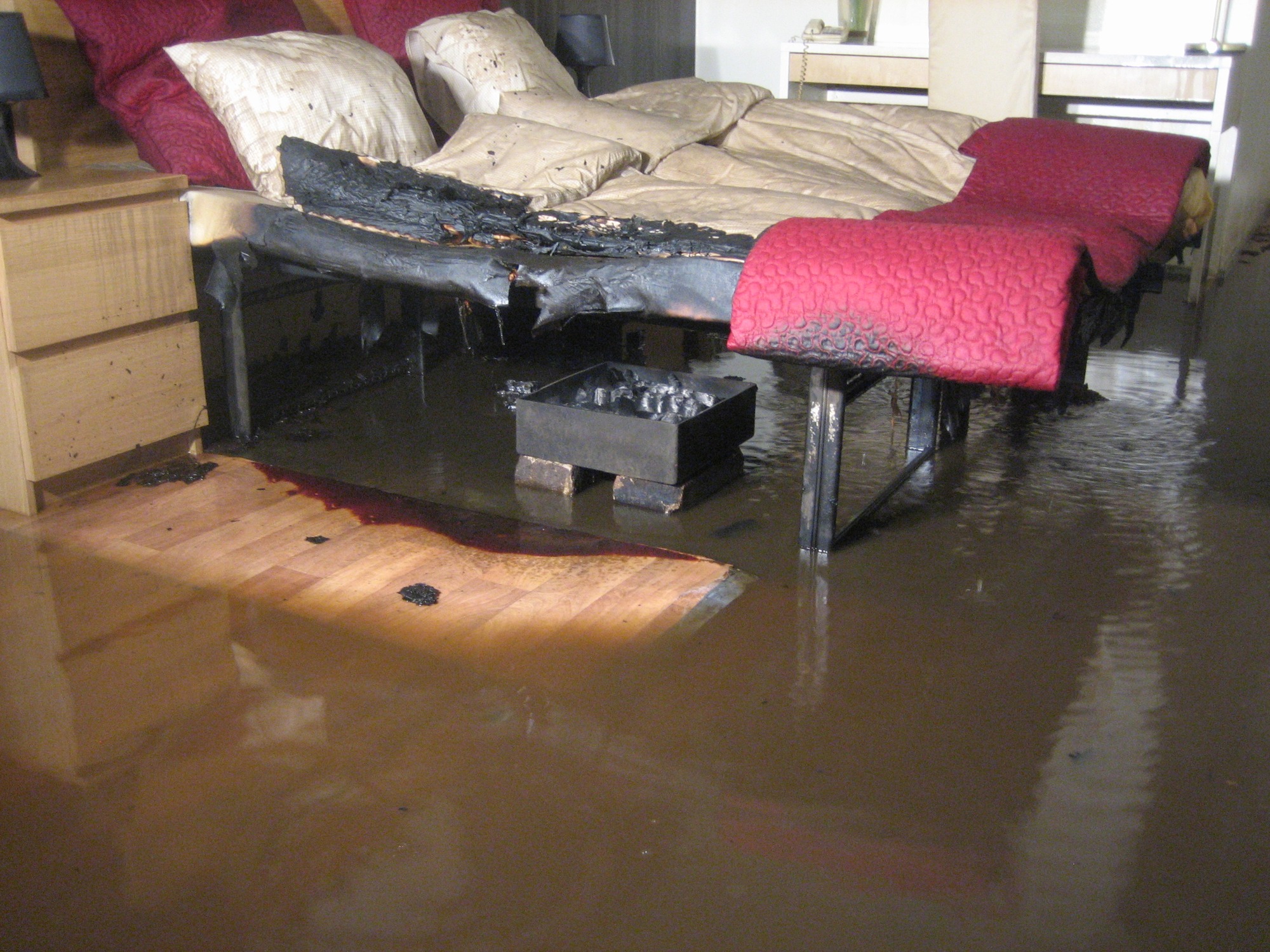 Obr. 18 Výsledek demonstrační zkoušky hašení hotelového pokoje sprinklerovým a vysokotlakým mlhovým SHZV obdobné dispozici byly provedené ohňové zkoušky s vysokotlakými mlhovými sprinklery řady 2000 typu C 20 Xx (K4,1), S 10 XX (K3,5) a C 12 XX (K1,9). K hašení se použilo čerpací zařízení SPU. Ačkoliv měly vysokotlaké mlhové sprinklery menší K faktor VdS zvýšila plochu chráněnou jedním sprinklerem u pokojového závěsného sprinkleru ze 16 m2 na 22,5 m2. U horizontálního sprinkleru z 20 m2 na 25 m2 a u sprinkleru pro předsíň z 12,25 m2 na 16 m2. Současně u těchto vysokotlakých mlhových sprinklerů řady 2000 byla snížená přípustná výška místnosti z 5 m na 3,5 m u pokoje a z 3 m na 2,5 m u předsíně. V této souvislosti je třeba uvést, že interpretaci výsledků ohňových zkoušek může provádět pouze autorizovaná osoba.