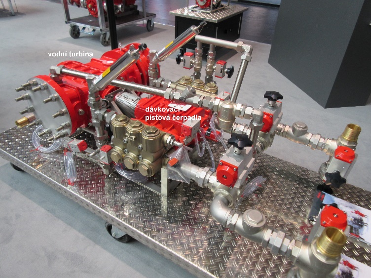Provedení přiměšovače FireDos je patrné z obrázku 15. Jde o přiměšovač, jehož součástí je pístové dávkovací čerpadlo poháněné vodním motorem (turbínou) umístěným v hlavním potrubí pro dopravu vody. Přiměšovač FireDos se vyrábí ve dvanácti velikostech. Od nejmenší, s automatickou regulací v rozsahu průtoků 10 l/min až 130 l/min, po největší, s regulací přiměšování v rozsahu průtoků 800 l/min až 20 000 l/min. Může se instalovat v jednotlivých pěnových soustavách nebo jako centrální přiměšovač.