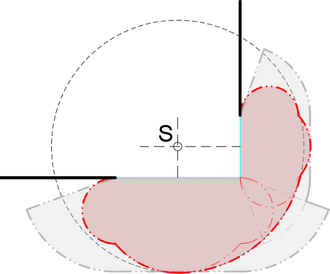 | 4. | Protnutí kolmic je středem kružnice, která má poloměr o velikosti vzdálenosti střetu kolmic k maximální odstupové vzdálenosti ze středu jednotlivých okenních otvorů | |