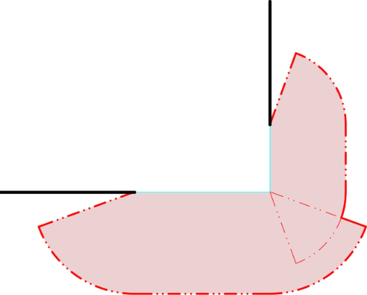 Výsledné vykreslení tvaru požárně nebezpečného prostoru rohového okna o vnitřním úhlu 90° není příliš komplikované. Na následujícím obr. 5 jsou zakresleny rozdíly mezi odstupovými vzdálenostmi uvažovanými pro jednotlivé okenní otvory a stanovením odstupové vzdálenosti od rohového okna pomocí FDS. Hvězdicovitá křivka značí výstup z FDS, který je v AutoCADu proložený křivkou vytvořenou příkazem SPLINE.