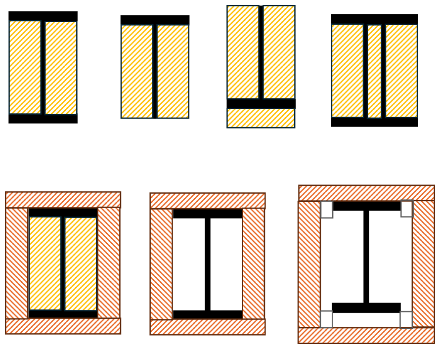 Na tuto myšlenku navázaly v následujících desetiletích desítky experimentů a výpočtů, které ji postupně rozvíjely [3–8]. Vědci zkoumali různé tvary profilů, od klasických I nosníků po složitější svařované prvky, a různé způsoby opláštění. Ukázalo se, že i částečné zakrytí profilu má měřitelný efekt: teplota oceli roste pomaleji a doba, po kterou si konstrukce zachová jpožární odolnost, se znatelně prodlužuje. Tento jev je dobře patrný i na výsledcích simulací, které ukazují, že dřevěný obklad způsobuje nerovnoměrné rozložení teploty v profilu. Některé části oceli zůstávají déle chladnější, což zpožďuje okamžik dosažení kritické teploty. Příklady možných geometrií opláštění ocelových prvků ukazuje Obr. 2, kde jsou zachyceny různé varianty částečného i úplného obkladu.