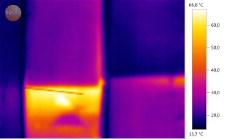 Během požáru byla termokamerou měřena teplota na neohořívané straně stěny, která oddělovala místnosti. Ze snímku je patrné, že některé spáry nebyly řádně dotěsněny, že některé rohože z minerální vlny mezi sloupky byly poškozeny při dopravě či montáži. Na obr. 14 je termosnímek dolního rohu. Teploty kolem 30 °C jsou naměřeny na těch částech stěny, kde došlo již během požáru na odhořívané straně stěny k porušení vrchní vrstvy sádrokartonu. Místo s více jak 50 °C označuje deformovanou desku z minerálních vláken.
