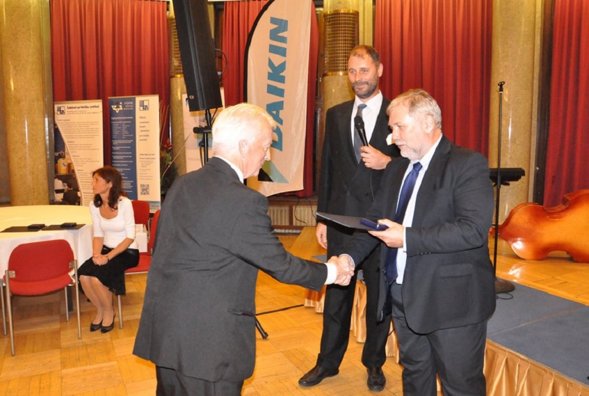 Zleva: Předávání ocenění na konferenci Třeboň 2017, Kongres Clima Praha 2013 navštívilo během 4 dnů 1000 účastníků - na fotografii prof. Kabele s Pavlem Hermanem ze společnosti Korado a.s., předávání ocenění na kongresu Clima Praha. Foto: archiv STP