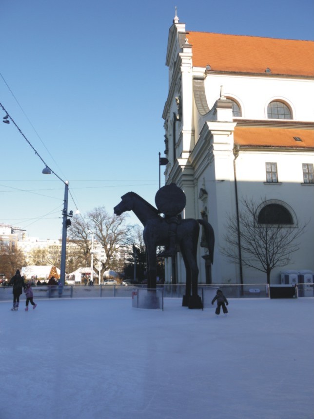 Brňané mají další alternativu k zimním radovánkám v čase vánočním, v centru Brna. Menší část Moravského náměstí hostí nové kluziště. Můžete si zabruslit pod „žirafou“, jak někteří Brňané přezdívají koni markraběte Jošta, který si, alespoň podle délky končetin oře, žije svůj sen sochy na velmi vysoké noze. Bruslení je zde atraktivně doplněno o kulisu kostela sv. Tomáše. Kolem proudí lidé z Moravského náměstí na náměstí Svobody, jezdí kolem tramvaje a část veřejné dopravy. V této vřavě je oáza bruslení se sochou markraběte uprostřed příjemným zpestřením. Pochopitelně to není první místo k bruslení v centru Brna, ale na tomto místě má svoji vzácnou premiéru. Co na tom, že počasí připomíná spíše říjen, než prosinec. Trochu nám to devalvuje pocit z Vánoc samotných. Nicméně takové zabrusleníčko, potom nějaké Bombardiňo, Svařáček nebo nějaký podobný stěnolez, to je pravé kouzlo Vánoc. A o tom bych dal hlasovat. 100 % pro, nikdo proti, nikdo se nezdržel hlasování. No, a jde se na to…