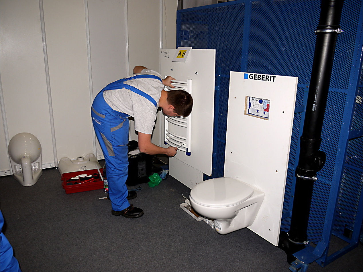 Prošel jsem si celý pavilon, abych věděl, co mohu očekávat. Jeden z větších stánků v čele poskytoval útočiště Cechu topenářů a instalatérů České republiky, pod jehož záštitou se odehrávala část akcí a doprovodných programů. Okolo byly stánky dalších společností, které jsou členy cechu, popřípadě společností se stejným zaměřením, přednášková část se sezením, promítací plochou a pódiem a v zadní části u stěny pracovní ponky, pracovní kóje jako simulace částí koupelen a WC, pro soutěžní klání a přehlídku zručnosti studentů.