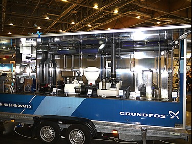 Velmi zajímavý stánek byl zároveň exponátem u společnosti GRUNDFOS s.r.o. Co do počtu zaměstnanců a vyrobených kusů čerpadel se GRUNDFOS řadí mezi největší světové výrobce v tomto segmentu. V jeho sortimentu najdete oběhová, ponorná i kalová čerpadla, domácí vodárny, průmyslová čerpadla, čerpadla pro vodohospodářské aplikace, dávkovací čerpadla a jejich příslušenství. Stánek byl vlastně přívěs se čtyřmi odklápěcími stěnami, za nimiž se skrývala jednotlivá modelová řešení v reálných souvislostech s využitím komponentů vyráběných společností. Nápadité, přehledné, velmi názorné. Technicky velmi precizně zpracované. Přijedete na jakoukoliv akci, odklopíte stěny a názorné ukázky mohou probíhat. Zahouká siréna, konec akce, „padla“, zavřeme stěny, odjedeme a je uklizeno. Budeme se těšit, nashledanou příště. Skvělé!