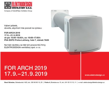 Dovolujeme si Vás pozvat na mezinárodní stavební veletrh For Arch ve dnech 17. až 21.9. 2019 na výstavišti PVA EXPO PRAHA Letňany.